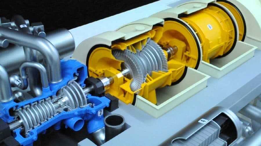 Агрегат разработан французской машиностроительной компанией Alstom, габариты сооружения поражают: двигатель обладает весом 1400 тонны и диаметром 6,4 м, его высота — свыше 70 м. Турбинный генератор имеет скорость вращения 1500 оборотов в минуту.