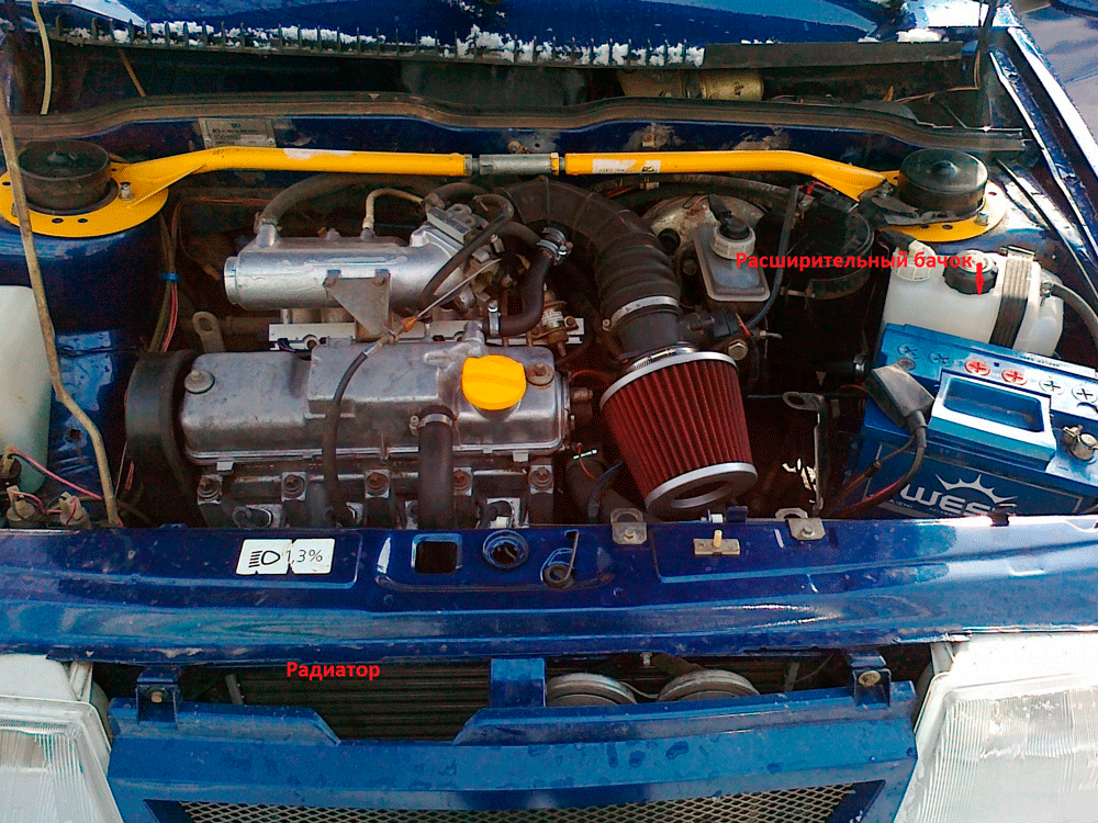 - Открутите крышку расширительного бачка и накачивайте туда воздух, пока из дроссельного узла или патрубка не пойдёт охлаждайка.