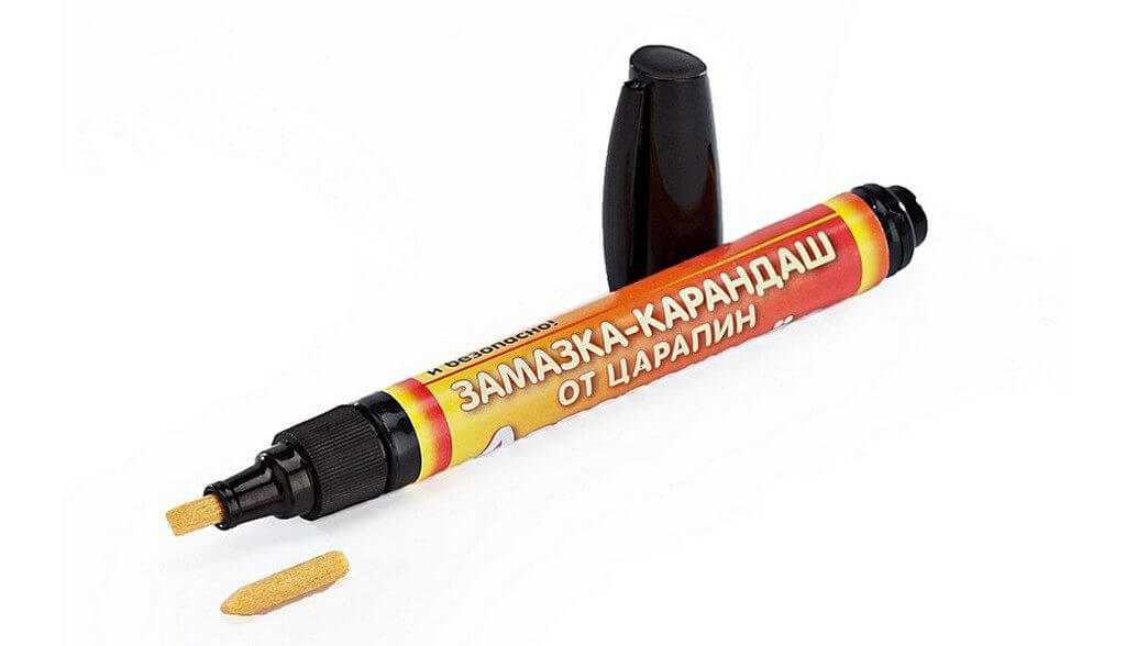 Замазка-карандаш. В основу этого средства входит особый бесцветный лак. Во время нанесения он проникает внутрь царапины и со временем затвердевает там, образуя прочный барьер и полностью скрывая всякие следы деформации. Однако следует отметить, что использование такого маркера актуально исключительно для неглубоких царапин, глубина которых не превышает толщины лакокрасочного покрытия. Если же повреждение более глубокое и проникает в слой грунтовки или металла, то маркер, конечно же, сможет выровнять поверхность. Однако из-за того, что он бесцветен, царапина все равно будет видна.