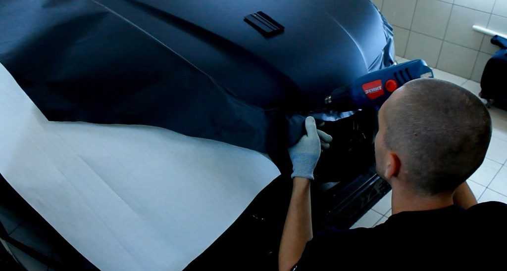 С помощью таких каналов избавляются от воздуха и выравнивают поверхность. Клей должен хорошо закреплять углы и край пленки, но при этом бережно ложиться на поверхность машины.