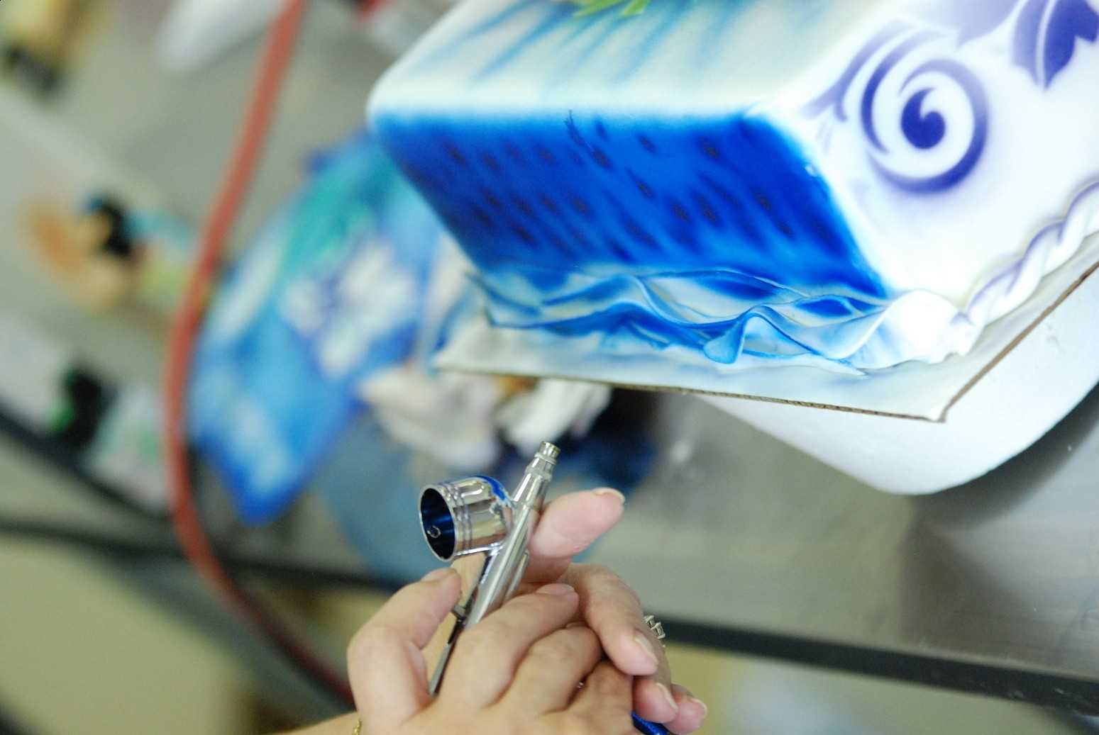 Это самый простой тип устройств в плане применения. Но процесс распыления может сопровождаться образованием клякс, так что для рисования мелких элементов он не подходит. Им чаще выполняют грубую отделку, создают фон на большой площади или покрывают изображение лаком.