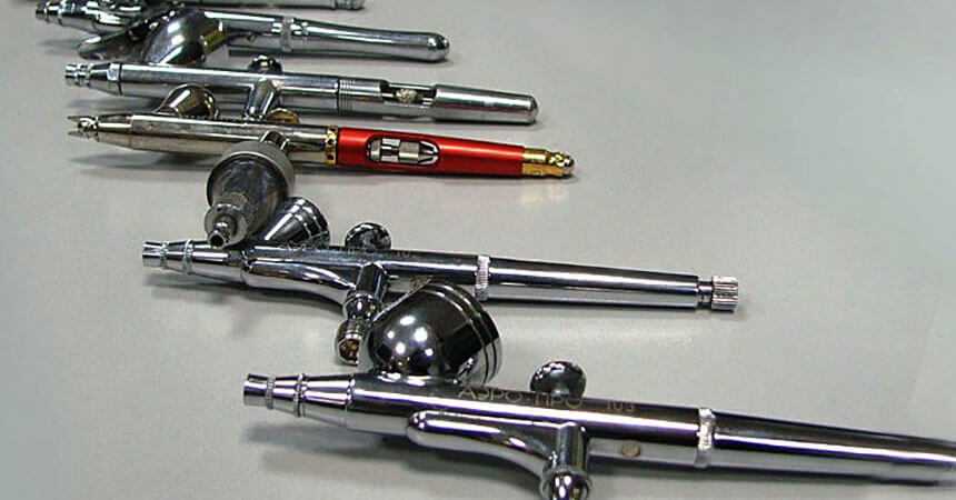 Агрегаты больше всего похожие на стандартный краскопульт, подсоединяемый к компрессору. Они оснащены курком в нижней части корпуса. Таким устройством можно работать долгое время без усталости, но специфический принцип регулирования подачи материала усложняет реализацию изображений с мелкими и тонкими элементами. Поэтому подобные распылители предпочтительны для оформления фонов и создания лакированных покрытий.