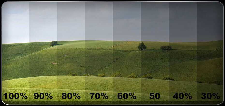 - пленки с 40—70% пропуска света. Сквозь приспособления, пропускающие от 50% света, можно увидеть некоторые предметы в машине, однако сейчас 50% пленки не разрешены законом;