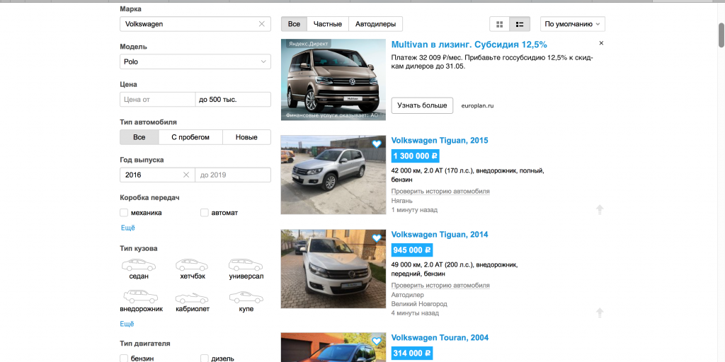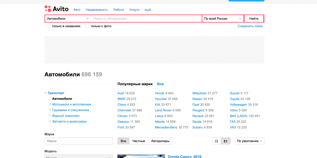 Лучше всего автомобильный рынок представлен на Авито Авто. Здесь собрано почти 700 000 объявлений о продаже машин, как от частников, так и от дилеров.