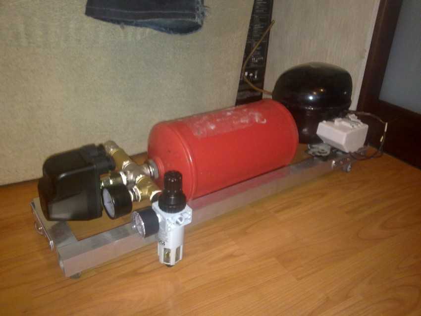 В качестве основных элементов берутся: мотор-компрессор от холодильника (лучше производства СССР) и баллон огнетушителя, который будет использован в качестве ресивера. Если в наличии их нет, то компрессор от неработающего холодильника можно поискать в мастерских по ремонту или в пунктах приёма металла. Огнетушитель можно приобрести на вторичном рынке или привлечь к поискам знакомых, на работе у которых могут быть списанные ОХП, ОВП, ОУ на 10 л. Баллон огнетушителя должен быть безопасно опорожнён.