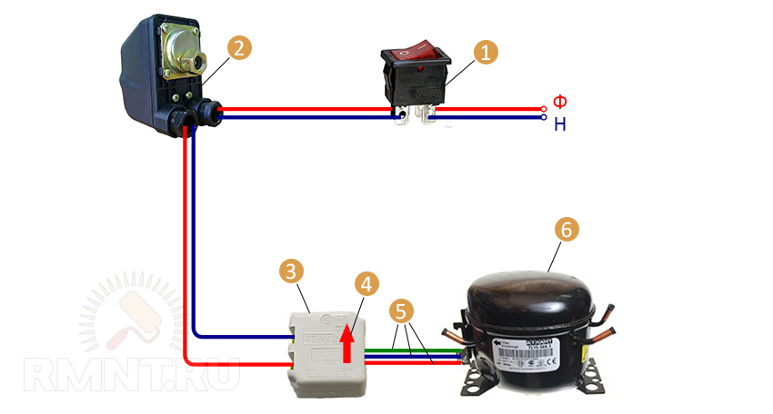 С помощью реле мы сможем подать в ресивер нужное нам давление, обеспечив при этом ступенчатую работу механизма. Реле настраивается двумя пружинами, одна из которых задаёт верхнюю границу давления, а вторая — нижнюю.Один контакт соединяем с нагнетателем, второй коммутируем с нулевой фазой сети. Второй сетевой вход нагнетателя соединяем посредством тумблера с фазой электросети. Тумблер даст возможность включать и выключать устройство от электропитания, не вынимая вилку из розетки. Осуществляем пайку и изолируем все электрические контакты. После покраски наш самодельный компрессор для авто будет готов к испытаниям.