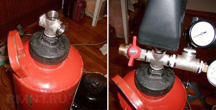 Далее фильтр для очистки от масла и влаги подключаем к входу редуктора, который нам будет необходим для развязки давления в двигателе и баллоне. Осуществляем соединение по водопроводному крестовику с левой или правой стороны. С противоположной стороны крестовины ставим манометр для контроля уровня давления в баллоне. На верхний конец крестовика монтируем реле для регулировки. Уплотнение всех соединений выполняется при помощи герметика.