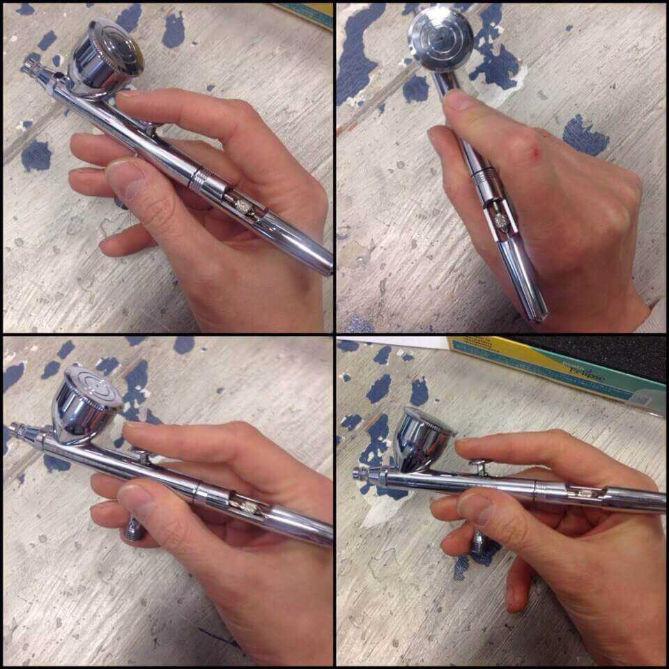 Чтобы вам было удобно красить аэрографом, держите его в руках подобно обычной авторучке (между средним и большим пальцем). Нажимать на педаль (триггер) нужно указательным пальцем. Таким образом, добейтесь того, чтобы прибор при нанесении краски лежал у вас в руке надежно и при этом не перенапрягал руку.