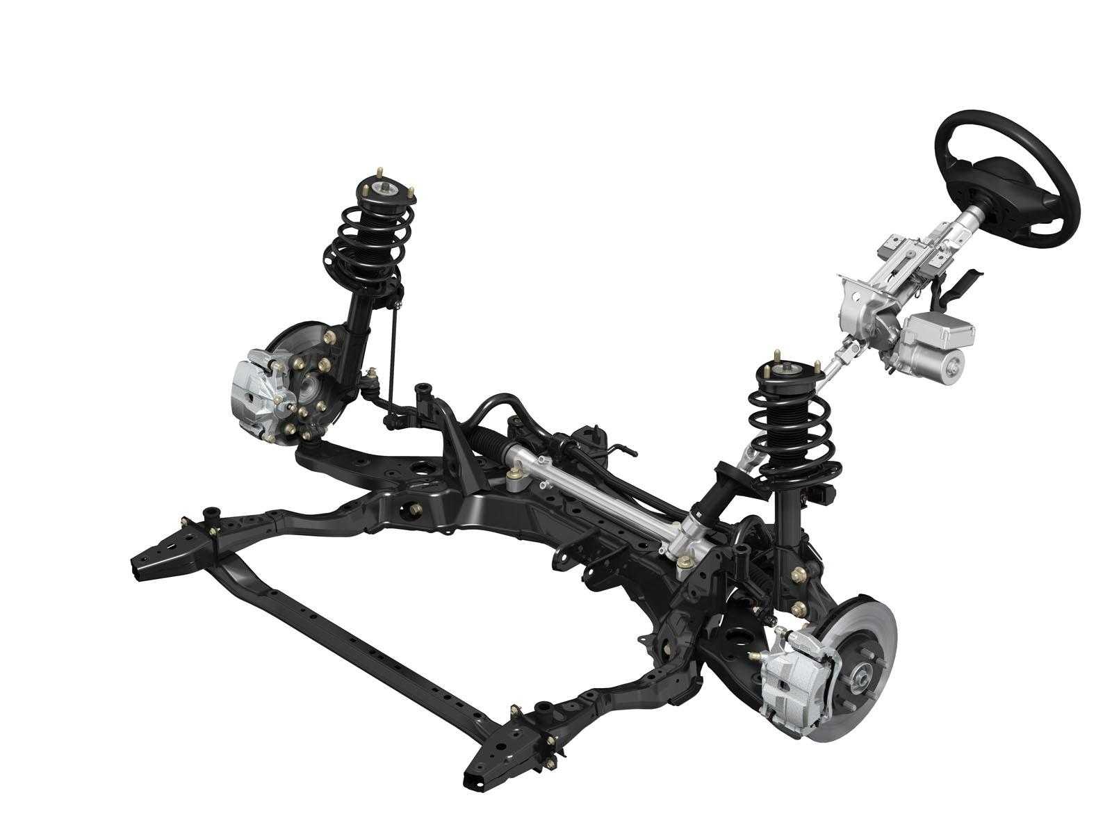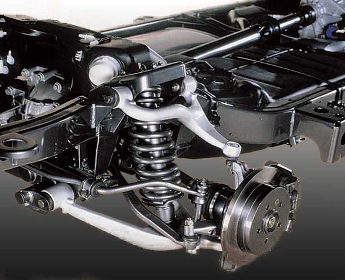 Общий вид устройства передней подвески: 1 — подрамник подвески; 2 — рычаг подвески с сайлентблоками и шаровой опорой; 3 — поворотный кулак со ступицей и подшипником; 4 — амортизационная стойка; 5 — штанга стабилизатора поперечной устойчивости.